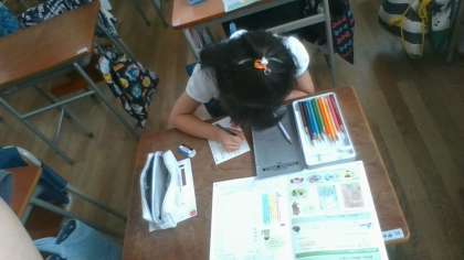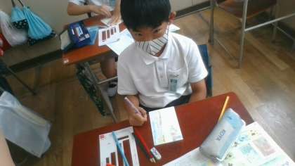 もうすぐ暑中見舞いの季節です。はがきを書く時期や内容、はがきの文章は「前文・本文・末文」にわかれていることなど学んだ後、実際にはがきを使って担任の先生宛に暑中見舞いのはがきを書きました。「先生はどんなイラストなら喜ぶかな〜?」と想像しながら集中して書いていました。このはがきは7月7日(木)にポストに入れるのが宿題です。どんなはがきになっているか楽しみです♪