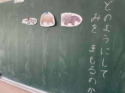 教科書を使ってヤマアラシのとげに見立てたり、丸まってアルマジロを真似たり