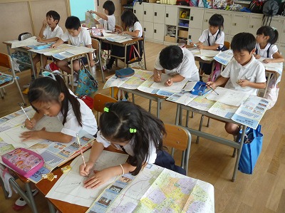 先日、社会見学でスカイビルの空中庭園に行き、そこから大阪市内の名所を確認しましたが、今日は、大阪城、長居公園、科学館、天王寺動物園、鶴見緑地などの大阪市内の有名な施設や場所を、大きな大阪市の地図から探し出し、それを「大阪市の白地図」に写し取っていました。