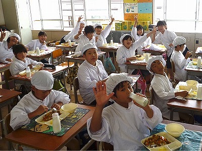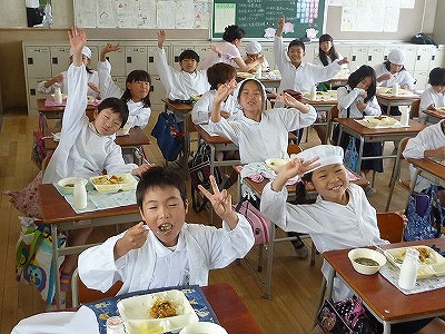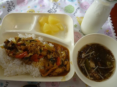 「和風カレー丼」は、まさに和風でした。お肉は豚肉でしたが、うすあげにおネギ、しょうゆ風味で、和風だしも入っています。子どもたちもいつもとは違うカレーに少し困惑気味でしたが、気に入ってモリモリと食べてくれました。