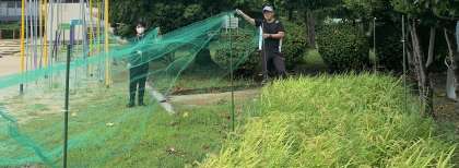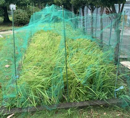 せっかく実ってきているイネを小鳥たちに食べられないよう、