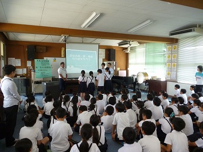 代表の児童がしっかりとあいさつをした後、まずはスライドで雲について説明を聞きました。