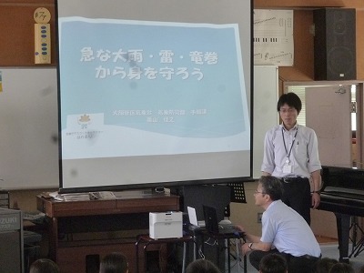 3・4時間目の2時間を通して、大阪管区気象台より3名の方にお越しいただいて「急な大雨・雷・竜巻から身を守ろう!」というテーマで授業を行いました。