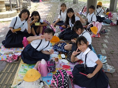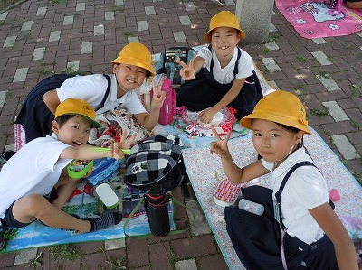 お友達と「おいしいお弁当、いただきま〜す」。