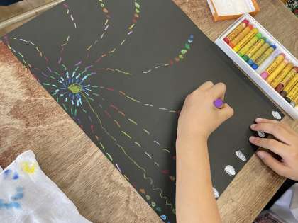 黒い画用紙にクレパスを使い、好きな形・色・大きさの花火をそれぞれ描きました。