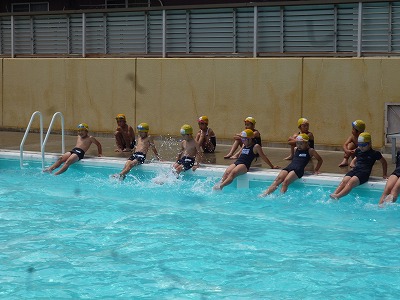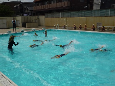 今日は、まず、プールサイドで足で水をける動きの確認をした後、バタ足の練習でした。プールの横幅を何往復も練習しました。