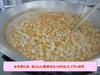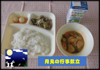 一口がんもと里芋のみそ煮、牛肉と野菜のいためもの、みたらしだんご、米飯、牛乳