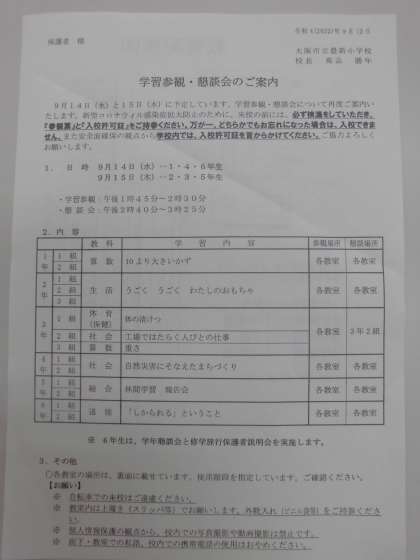 2日間に分けての実施です。先日配付(8月26日)した『参観票』と『入校許可証』を必ずご持参ください。どちらかでもお忘れの場合は、感染予防・安全面の観点から入校できません。参観していただけるのは、『最小限の同居家族のみ』とさせていただいております。ご理解、ご協力よろしくお願いします。