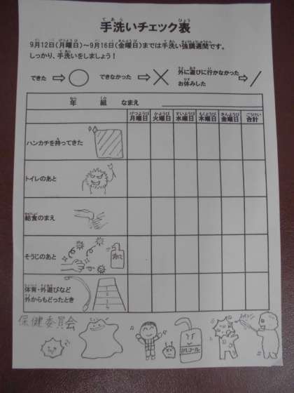 9月12日(月)〜16日(金)は、手洗い強調週間です。児童朝会で保健委員会からお知らせがありました。ポスターや手洗いチェック表のイラストは保健委員会で作成しました。しっかり手洗いをしましょう!