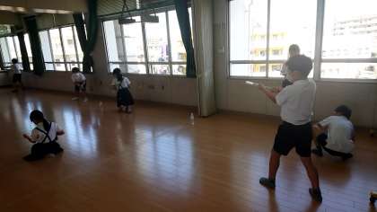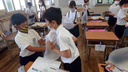 とじこめた空気や水の単元に入りました。空気と水の実験キットを使って、とじこめた袋を通して感じたことを話し合ったり、空気でっぽうで玉をとばしたりしました。おしぼうで後玉の位置を調節することで飛距離が変わることに気づいている子がたくさんいました。