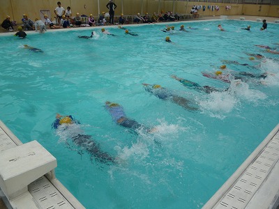 いざ、服を着て水中に入ってみると、思うように浮かない、泳ぎづらい、くつが重い、服が体にへばりつく、など、多くのことを体験してくれました。