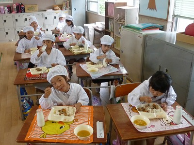 1年生は配膳だけでなく、食べるスピードも速くなってきて、時間内にたいていの子は食べ終えられるようになってきました。お替りもしっかりとしてくれます。嫌いな食べ物もがんばって食べています。