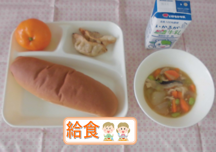 あげぎょうざ、鶏肉ととうがんの中華煮、冷凍みかん、黒糖パン、牛乳