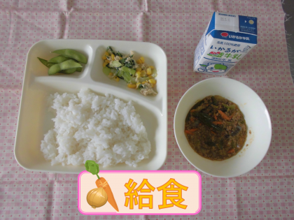 マーボーなす、チンゲンサイとコーンのいためもの、枝豆、米飯、牛乳