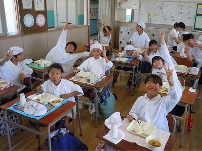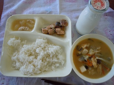 「冬瓜の煮物」の冬瓜は、子どもたちの多くは「これって大根?」「大根みたいやん」といっていました。水溶きでんぷんでとろみがつけられていておいしかったです。