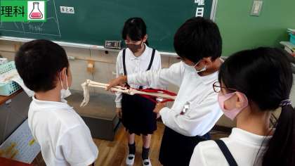 理科ではヒトはどのように体を動かしているのかを自分のうでを動かしたり、動画やもけいを使ったりして調べました。うでをのばしているときでもちぢんでいるきん肉があることに気づくことができました。『じゃあ、足のきん肉はどうなっているのだろう』とふしぎに思っている子もいました。