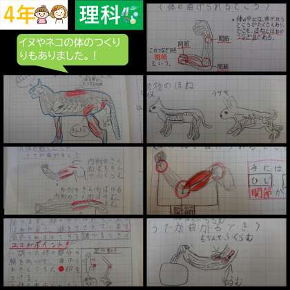 「ヒトの体のつくりと運動」のふりかえりをした後に、まとめノートをつくりました。ウサギやウマだけでなく、ネコやイヌ、シャチの体のつくりをかいている子もいました。また、関節のところを赤丸でくわしく目立たせている子が多かったです。