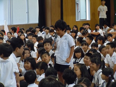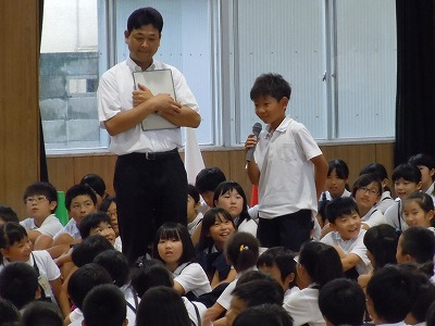 そのがんばりをじかに聞きたくて、各学年2人ずつマイクを渡し、お話をしてもらいました。突然の指名で、びっくり、緊張だったと思いますが、大きな声でお話をしてくれ、とてもうれしかったです。