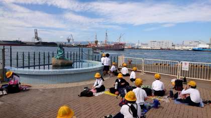 昼食は海が見えるところで食べました。食べているときに、「サンタマリア号」も見ることができました。