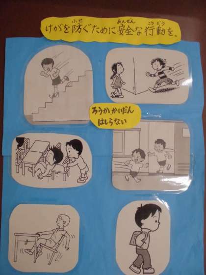 ろうかや階段で走っている人はいませんか?ぶつかってけがをしている人がいます。ルールをまもって、けがをしないようにしましょう。