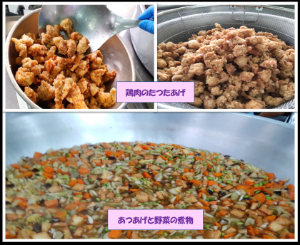 大人気メニューの、鶏肉のたつたあげに、野菜たっぷりの煮物!