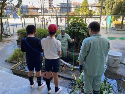 休み時間の度に、子ども達は集まってきます。池の掃除に興味津々です。思いのほかしっかりと汚れていたようで・・・。