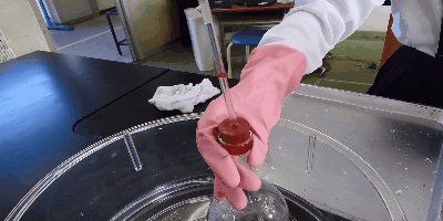 「空気は温度によって、体積が変わるのだろうかを」を問題に学習しました。今回は丸底フラスコをあたためたり、氷水につけて冷やしたりしてガラス管の中のゼリーの位置の変化を調べました。