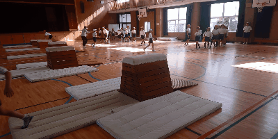 今まで横に置いていたとび箱の7段をたてにして、「かかえこみとび」をとんでみました。今回で体育でするとび箱は終わりになります。また、来年が楽しみですね。