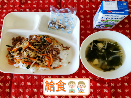 ビビンバ、わかめスープ、米飯、アーモンドフィッシュ、牛乳