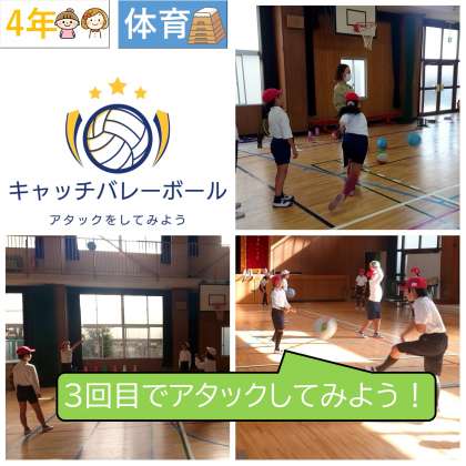 『キャッチバレーボール』の単元が始まりました。今回はチームに分かれてボールを投げ合い、3回目でアタックをしました。ボールをキャッチして、ボールを落とさないように続けるのがむずかしかったです。
