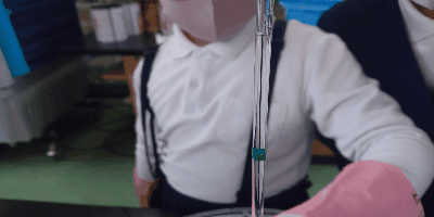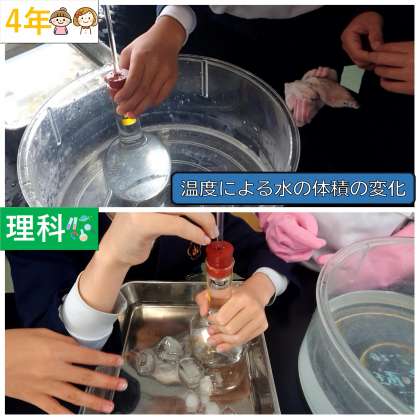 『水も空気のように、温度によって体積が変わるのだろうか』をめあてに学習しました。空気の次は「水」です。空気の時より変化がゆっくりだったので、じっくりと水面のようすを調べました。