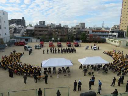 東淀川警察・消防署による『東淀川区歳末特別警戒隊発隊式』が豊新小学校で行われました。パトカーや消防車が校庭に集まり、目を輝かす子どもがたくさんいました。警察官や消防隊の方々の規律ある行動を観て、子どもたちは、「かっこいい」と声をそろえて言っていました。