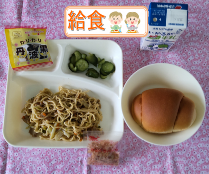 和風焼きそば、きゅうりのしょうがづけ、いり黒豆、かつおぶし、1/2黒糖パン、牛乳