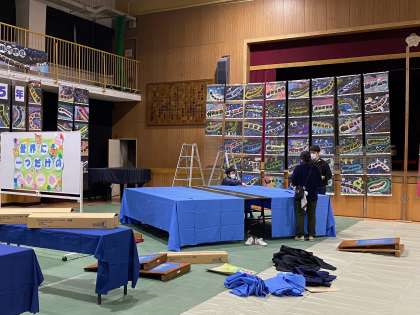 子ども達の作品をどのように魅せるかは、先生達の腕の見せ所です!遅くまでありがとうございます!