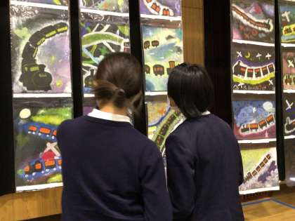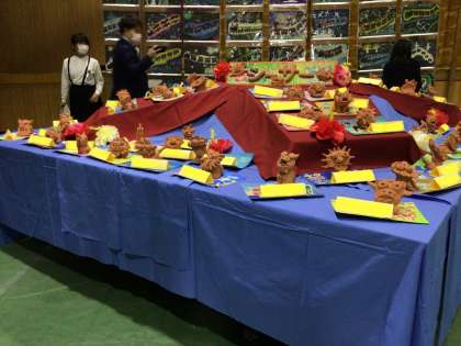 5年生では、金曜日に立体作品「シーサー」及び、平面作品「銀河鉄道」を講堂に搬入しました。