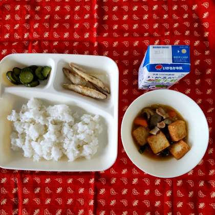 きびなごてんぷら、あつあげと野菜の煮物、きゅうりの甘酢漬け、米飯、牛乳
