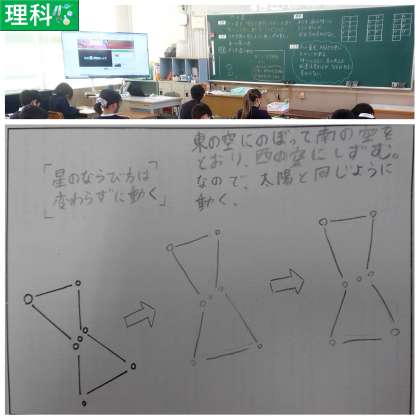 「冬の星も、明るさや色にちがいがあり、時こくとともに動くのか」をめあてに学習しました。太陽や夏の星と同じように『東↗南↘西』のように動くと予想した子が多かったです。見る機会があれば観察してみましょう。