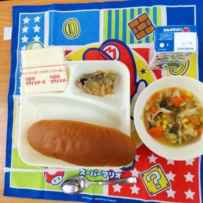 最初の給食は、あじのレモンマリネ、てぼ豆のスープ煮、スライスチーズ、黒糖パン、牛乳です。