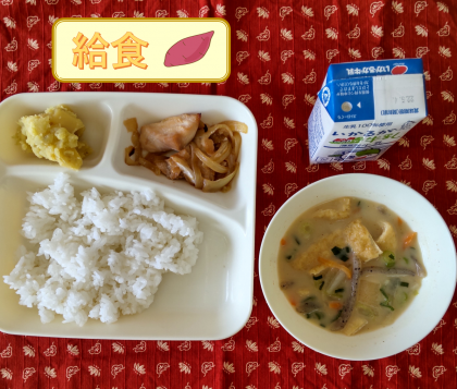 鶏肉の甘辛焼き、かす汁、栗きんとん、米飯、牛乳