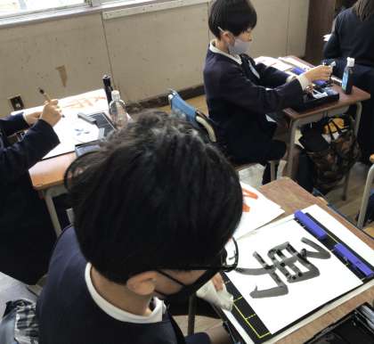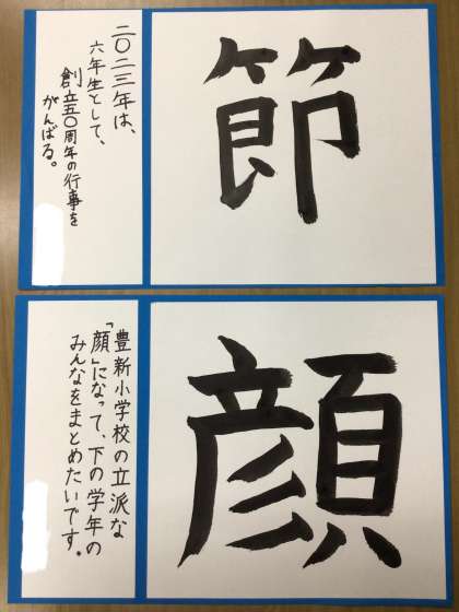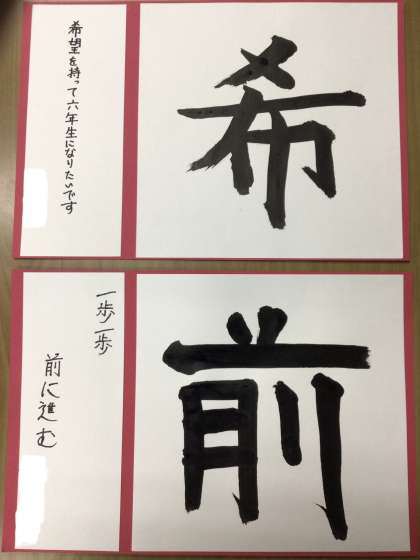 5年生では、書写の時間に今年の抱負を漢字一文字で書きました。