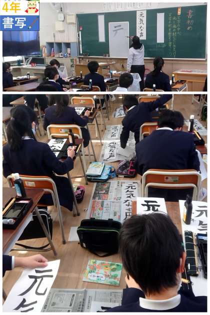 「文字の中心、画と画の間などに気をつけて文字の形を整えて書こう」をめあてに『元気な声』の書初めをしました。3枚書きましたが、書くたびにていねいな字になりました。