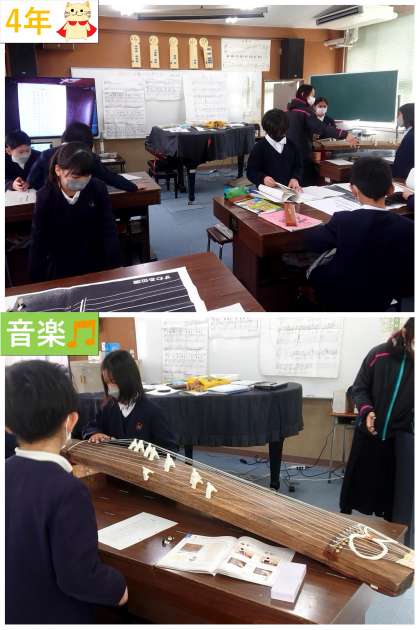 「どんな音が出るかな」をめあてに学習しました。箏を弾いてみると『弦がかたかった』『音を出すのが難しかった』といった感想を聞くことができました。