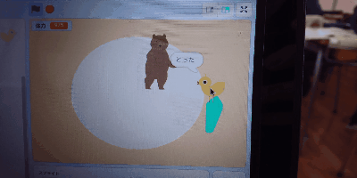 スクラッチを使って『冒険ゲーム』をつくりました。『キャラクター同士でぶつかったらしゃべるようにして、キャラクターがクリスタルにぶつかったら、喜んでしゃべるようにつくったよ。』と教えてくれました。