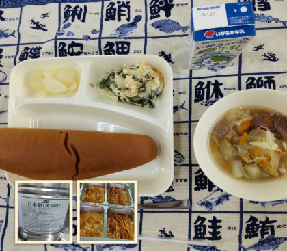 今日の献立は、「ほたて貝のグラタン、スープ、和なし(カット缶)、黒糖パン、牛乳」です。
