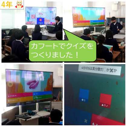 カフートというクイズアプリを使ってクイズをつくりました。『5・7・5・7・7が何をあらわすのか』『4/5は真分数であるか〇か✕か』といった今までの学習に関連した問題を作ってみました。また、子どもたちが司会役になってクイズ大会を開きました。