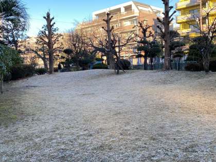 下の写真は、『豊新の森』が霜で白くなっています。