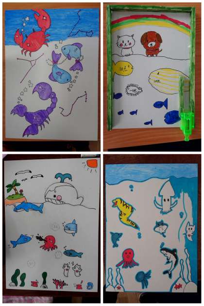 図工では、コリントゲームを作っています。海の生き物を下絵にかいている子が多かったです。ホームページでも作品を随時アップしていくので楽しみにしていてください。