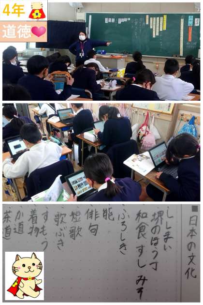 「大切にしたい日本の伝統と文化について知ろう」というめあてで学習しました。日本の文化には何があるかと聞くと、能や俳句、歌舞伎などたくさんの文化が出ました。また、調べたい日本の文化についてクロームブックを使ってくわしく調べました。