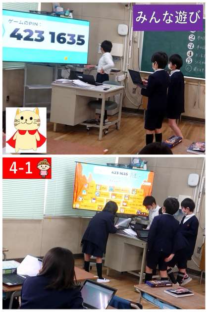 教室でカフートというクイズアプリを使ってクイズ大会をしました。自分たちでクイズを作ったり、司会をしたりして楽しく遊ぶことができました。お楽しみ会でもやってみたいですね。