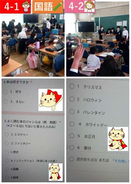国語では『調べたことをほうこくしよう』という単元を学習しています。クロームブックのフォームズというアプリを使ってアンケートを作成したり、班でまとめたことをほうこくしたりしました。